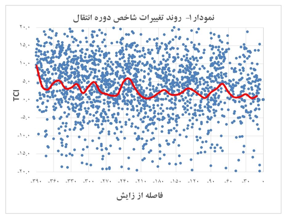 نمودار1 به منظور نظارت بر مدیریت دوره انتقال در طول زمان، توسعه داده شده است. هر نقطه نشانگر یک دام است که در محور عمودی مقدار TCI آن و در محور افقی فاصله بین زایش دام تا تاریخ فعلی گزارش شده است. به عنوان مثال عدد 120- در محور افقی بیانگر این است که 120 روز از زایش دام مورد نظر گذشته است.از آنجا که در شاخص TCIتلاش بر این است که برنامه مدیریت دوره انتقال به صورت یک مقدار عددی بیان شود، بسیار مهم است که اطلاعات گاوهایی که حذف شدهاند نادیده گرفته نشود. در روشی که توسط شرکت AgSourceتوسعه داده شده است، هر گاوی که دارای اولین رکورد شیر پس از زایش باشد در محاسبه TCI منظور خواهد شد.خطی که از وسط نقاط میگذرد بیانگر روند تغییرات میانگینTCIگله در بازههای زمانی مختلف است.به طور كلي هر چه مقدار TCI بيشتر باشد بهتر است. اگر مقدار TCI صفر باشد بدين معني است كه هماني كه انتظار داشته ايم رخ داده است