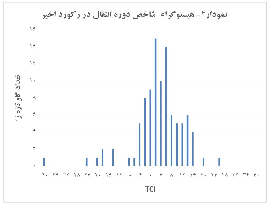 اين نمودار توزیع فراوانی TCIدر رکورد اخیر گله را نشان می دهد. به عنوان مثالدر نمودار فوق تعداد گاوهایی که مقدار عددی TCIآن ها عدد صفر است، 9 رأس می باشند.