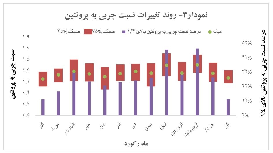 اين نمودار شامل آماره های جعبه ای (صدک های 25، 50 و 75) نسبت چربي به پروتئين گاوهای تازه زا در 13 ركورد اخیر میباشد. همچنین نسبت دام های تازه زایی که این نسبت در آن ها بیش از 4/1 شده است به صورت میله های بنفش نشان داده شده است. نسبت چربی به پروتئین شیر یکی از شاخص های سنجش سلامت گاوهای تازه زا است. عدد مناسب برای این شاخص بین 1 تا 3/1 است و اعداد کمتر از 9/0 بیانگر اسیدوز احتمالی و بزرگ تر از 4/1 نشانگر کتوز احتمالی دام می باشد.
