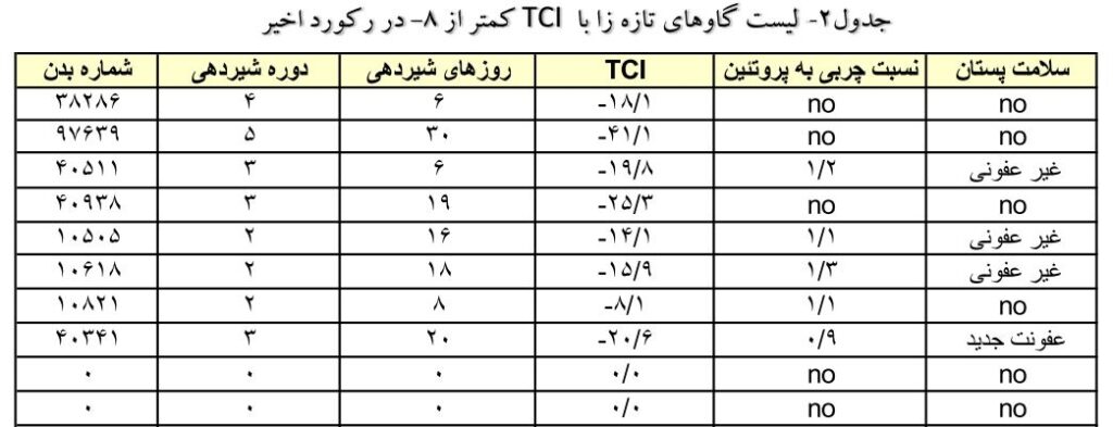 در جدول فوق لیست دام هایی که مقدار TCI کمتر از عدد 8- دارند به همراه نسبت چربی به پروتئین شیر و وضعیت سلامت پستان آن ها نشان داده شده است. سلامت پستان می تواند در چهار وضعیت غیر عفونی، عفونت جدید، عفونت مزمن و درمان شده قراربگیرد و با توجه به تعداد سلول های سوماتیک در آخرین رکورد دوره شیردهی قبلی و اولین رکورد شیردهی فعلی تعیین میشود.دام هایی که اطلاعات ترکیبات شیر و سوماتیک آن ها ناقص است با عبارت “no” مشخص شده اند.