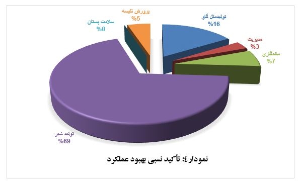 ♦در نمودار دایره ای 4 سهم هر حوزه در بهبود سود یکنواخت ماهیانه نشان داده شده است و دامدارانی که گله آن‌ها از لحاظ جمعیت اشباع است با یک نگاه اجمالی قادر به شناخت اولویتهای گله خود می‌باشند.