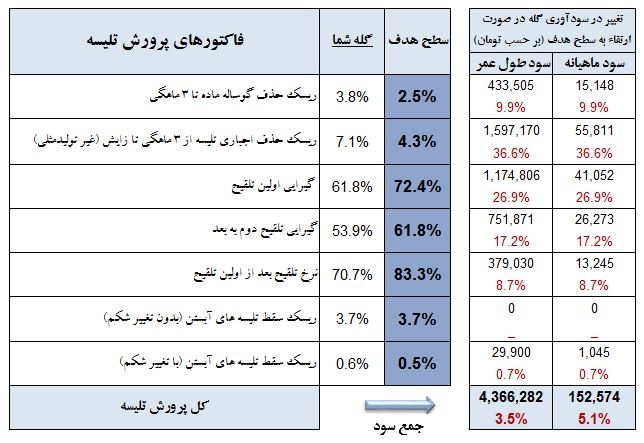 به عنوان مثال در جدول فوق ریسک حذف گوساله ماده تا 3 ماهگی برای گله شما و سطح هدف به ترتیب 8/3 و 5/2 درصد گزارش شده است و مقدار سود طول عمر 433،505 تومان (9/9 درصد) به دست آمده است، بدین معنی که اگر ریسک حذف گوساله ماده تا 3 ماهگی در گله شما از 8/3 درصد به 5/2 درصد کاهش یابد به ازای هر رأس دام مولد مبلغ 433،505 تومان سود بیشتری در طول عمر یک دام خواهید داشت. عدد 9/9 درصد هم بیانگر سهم سودآوری این فاکتور خاص در کل سود حاصل از بهبود عملکرد تلیسه است. در سطر آخر جدول تأثیرکلی شاخص‌های پرورش تلیسه بر حسب تومان و درصد، قابل مشاهده است. این اعداد همان اعدادی هستند که در نمودارهای ابتدایی قبلاً نشان داده شده بود.