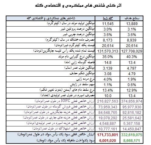 در این جدول ابتدا عملکرد کلی گله در صفات تولیدی، سلامت، تولیدمثل و ماندگاری نشان داده می‌شود و سپس شاخص‌های اقتصادی متناسب به عملکرد گله در حالت فعلی و در صورت رسیدن به سطوح هدف برآورد می‌گردد. در جداول قبلی اثر اقتصادی بهبود 50 شاخص مختلف به صورت انفرادی مشاهده شد. به عبارت دیگر شرط اساسی در محاسبه سود هر شاخص، ثابت ماندن بقیه 49 شاخص دیگر بود. اما همانطور که در مقدمه ذکر شد این فاکتورها علاوه بر اثر انفرادی اثر ترکیبی هم دارند؛ بدین معنی که اگر50 فاکتور همزمان تغییر کنند و به سطوح هدف برسند سودآوری گله از جمع سودآوری تک تک آنها بیشتر است. منظور از IOFC در این گزارش درآمد شیر پس از کسر هزینه برآورد شده خوراک است. همچنین ارزش خالص فعلی ( NPV یا NPW  یاNet present value ) تفاوت بین ارزش فعلی جریانات نقدی ورودی و ارزش فعلی جریان نقدی خروجی است و در علم اقتصاد مهندسی، یکی از روش‌های استاندارد ارزیابی طرح‌های اقتصادی می باشد. در این روش، جریان نقدی (درآمدها و هزینه‌ها) بر پایه زمان وقوع  به نرخ روز تنزیل می‌شود. به این ترتیب در جریان نقدی، ارزش زمان انجام هزینه یا به دست‌آمدن درآمد نیز لحاظ می‌گردد. و در پایان ارزش خالص فعلی سود یک راس مولد در طول عمر با محاسبه ( ارزش خالص IOFC  + ارزش خالص فروش گوساله در طول عمر) منهای (هزینه های جایگزینی +جاری + اسپرم + استهلاک) به دست می آید